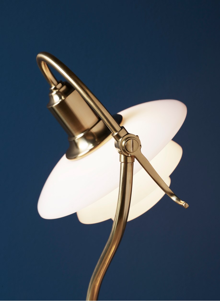 Limited edition 2021-varianten af PH 2/2 Spørgsmålstegnet leveres med et justerbart lampehoved. Det justerbare lampehoved, der kan drejes 45 grader til hver side, er en nøglefunktion, der gør det muligt at rette lyset derhen, hvor det er nødvendigt. Den justerbare øverste del af lampen kan vippes 45 grader til højre eller venstre ved at dreje håndtaget. Skærmene af mundblæst opalglas med tre lag giver lampen en naturlig individualitet, hvor hver skærm repræsenterer et kunstværk. Som ved den originale lampe vil messingen patinere med tiden og fremhæve det autentiske smukke udtryk, som 2021 limited edition-varianten af PH 2/2 Spørgsmålstegnet har. Den gennemgående afbryder, også af børstet messing, er placeret på standeren tæt ved foden sammen med en brun tekstilledning, der komplementerer det eksklusive design. PH's initialer er smukt og diskret indgraveret over ledningen.