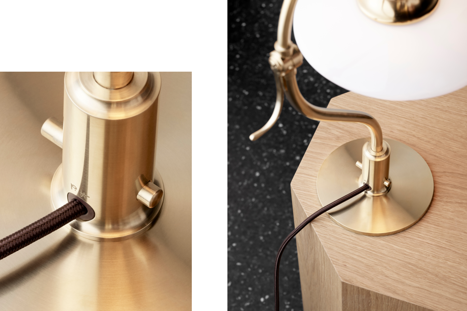 Det let børstede messingstel er ubehandlet ligesom på den originale lampe fra 1931, så lampen patinerer smukt med tiden. Den gennemgående afbryder, også af børstet messing, er placeret på standeren tæt ved foden sammen med en brun tekstilledning, der komplementerer det eksklusive design. PH's initialer er smukt og diskret indgraveret over ledningen.
