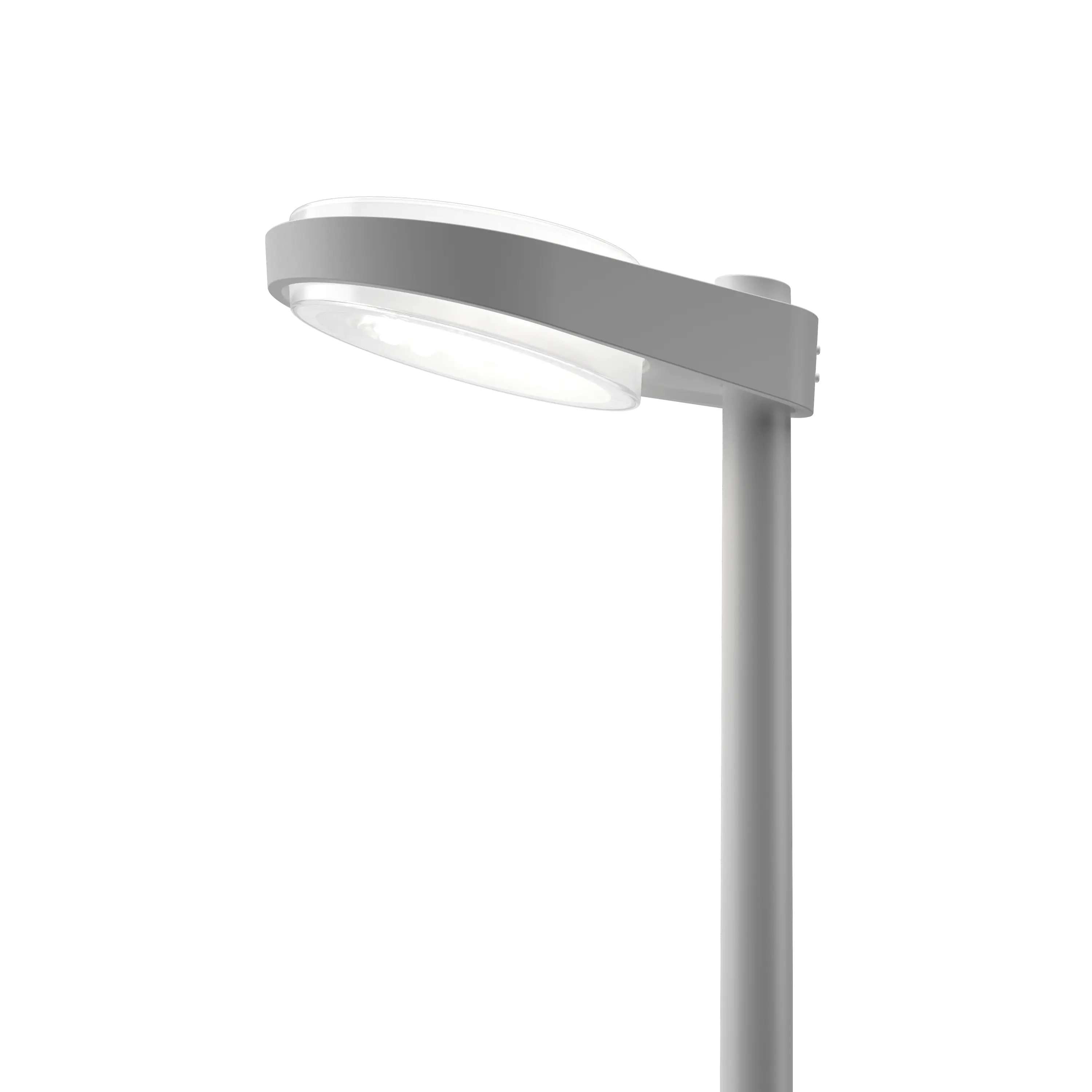 LP Capsule is characterized by a high degree of integration between the design elements. The fixture elegantly encircles the post for a more coherent solution. Viewed from above, the light consists of two circles – a large round lamp and a smaller round post where the tangents connect the two circles to form a simple geometric harmonious look. The basic idea was to create a cylindrical capsule, with the light source inside a single cylinder, which is in turn inside a larger opal cylinder. This is the source of the direct downward light, but by creating distance between the inner and outer cylinders, the fixture shines surplus light into the gap. Here it is reflected, illuminating the outer cylinder, which glows like a halo around the light source in the middle. This reduces glare and provides a smoother transition to the surrounding environment.