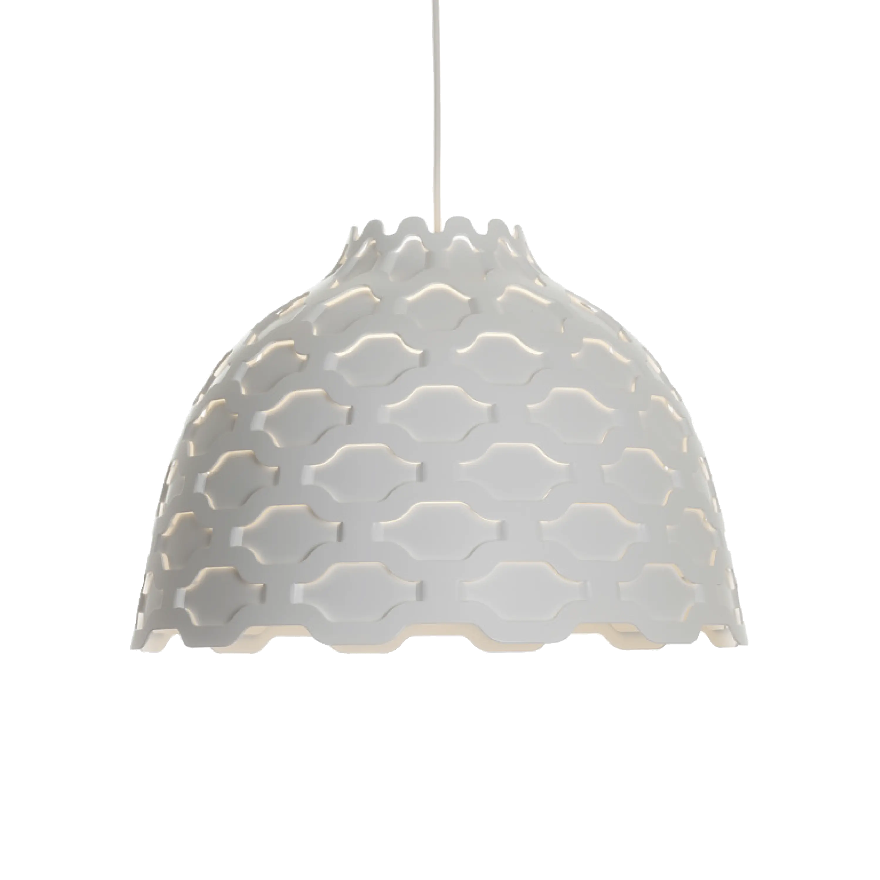 The concentrated light from the light source is filtered through an opalescent diffuser to ensure soft, comfortable light distribution. The softened light creates a pleasant atmosphere within the shade and ensures a gentle lighting effect on the outside, helping to illuminate and define the product's shape when lit. The aim was to create comfortable and atmospheric lighting fixture in both private and public settings. The starting point is a flat sheet of aluminium which is worked into the bell-shaped shade. The shade pattern is cut and pressed to form two interactive layers, through which the light is emitted in a high-precision pattern. The 3 mm thick shade ensures a very solid fixture, suitable for applications ranging from children's rooms to executive areas.