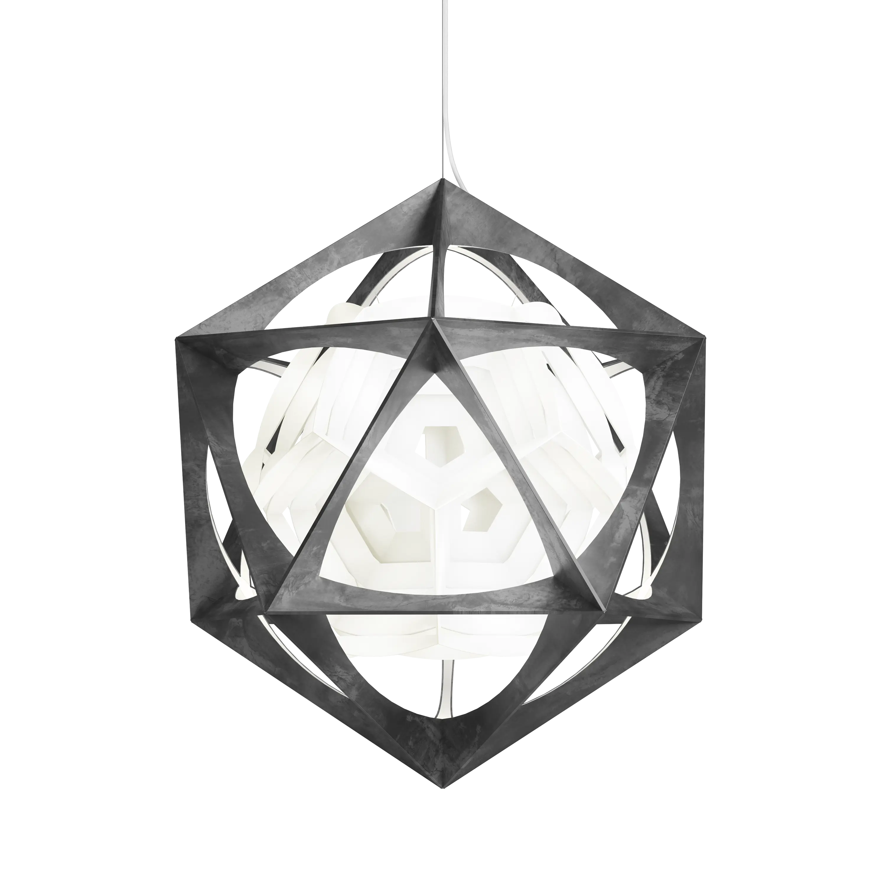 The pendant is composed of two contrasting yet interlinked geometric shapes. The outer layer is a rigid aluminium frame in the shape of an icosahedron with 20 triangular faces. Seemingly floating within the frame, is the inner form, a white polycarbonate reflector in the geometry of a dodecahedron with 12 pentagonal faces.