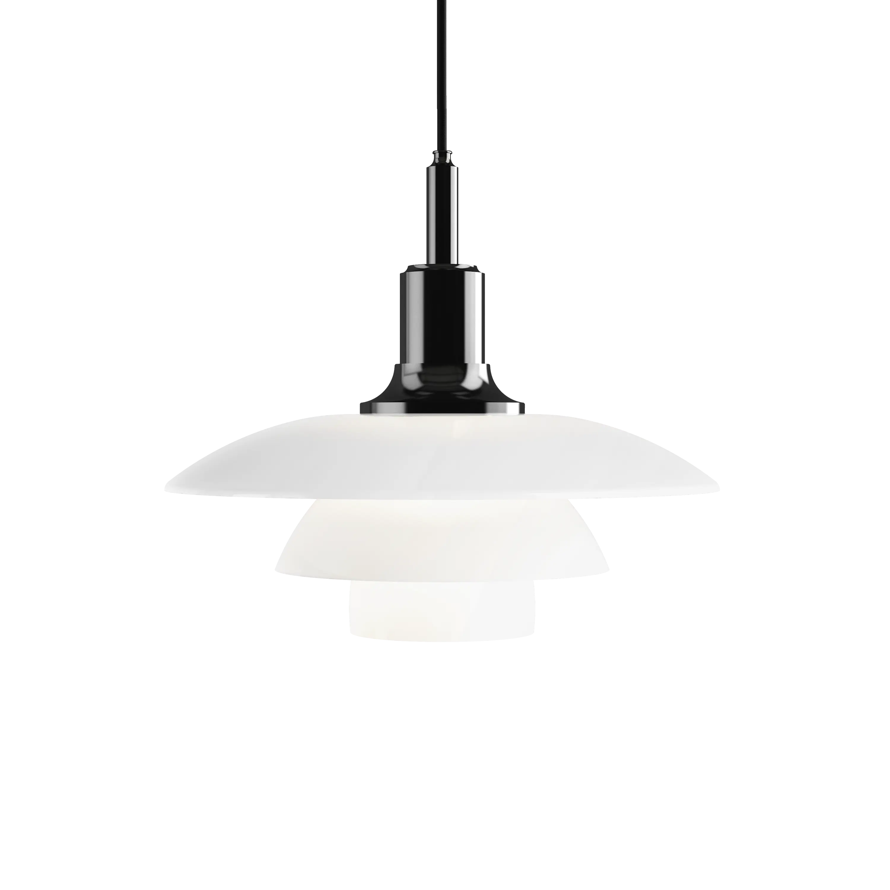 The PH 3½-3 Glass Pendant is one of many advanced projects undertaken by Poul Henningsen in the development of his world-famous three-shade system from 1926. Poul Henningsen devoted most of his life to taming electric light. He based his three-shade design on a logarithmic spiral to make optimum use of the light source. He was constantly doing calculations and tests. The form of the shades was determined by the way they were required to shape and reflect the light, and the lamp was designed to be glare-free.
