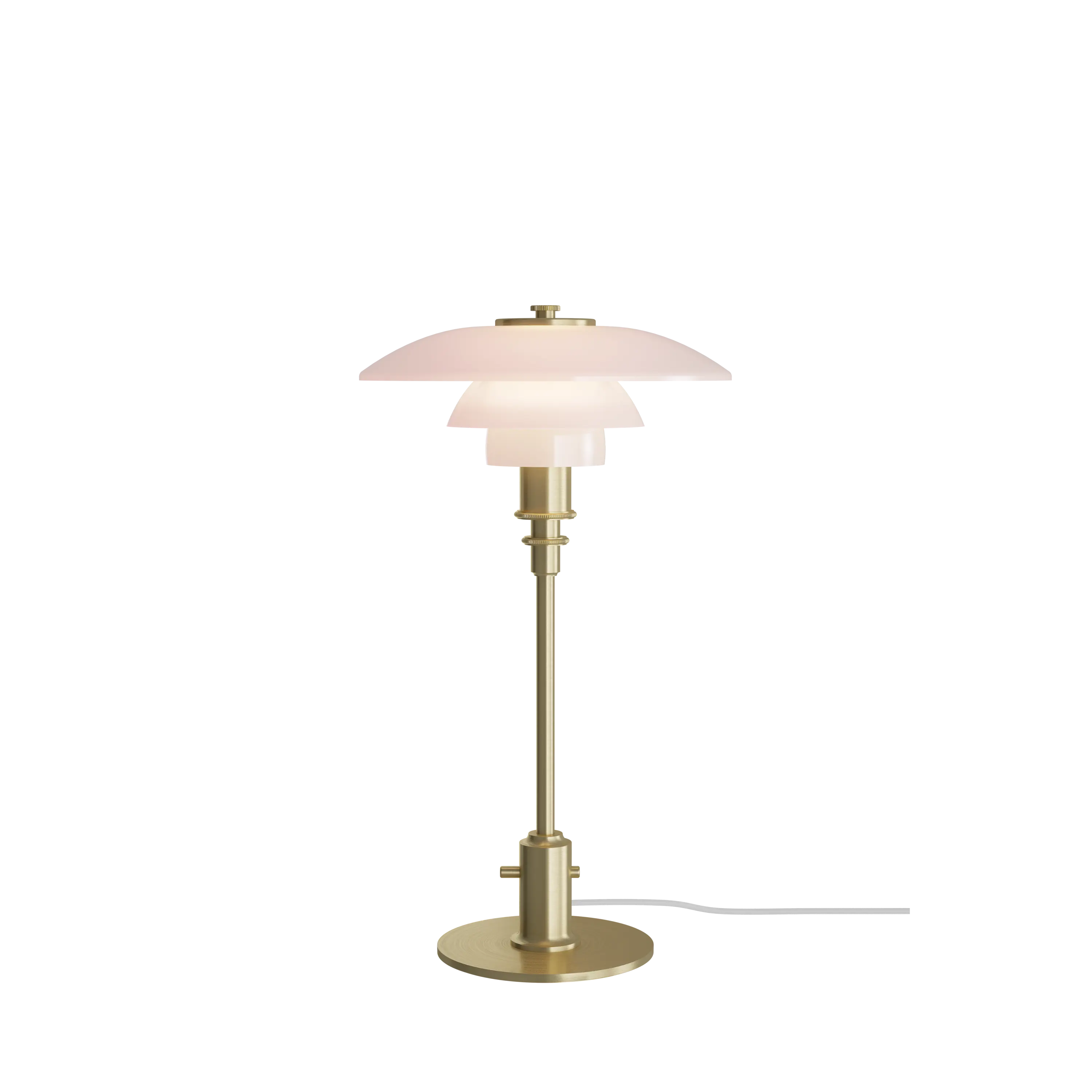 Today, the small size of the PH 2/1 Pale Rose Brass Table allows the lamp to fit in every corner of the home, whether it is on a little table, a shelf or a windowsill, which it will accentuate with an isle of fine light, creating poetic ambience around it. The soft curves and unique silhouette of the three-shade lamp combined with the pale rose colour, the clear edges and a white textile cord make the lamp stand out. The PH 2/1 Pale Rose Brass Table is just as captivating with the light turned off, where the glossy surface of the delicate mouth-blown Italian glass mirrors its surroundings. Just like in around 1930, the PH 2/1 comes in exquisite brushed brass with its distinctive go-through switch. The brass will patinate beautifully over time and provide the table lamp with even more character, unless it is carefully polished from time to time to maintain the original finish.