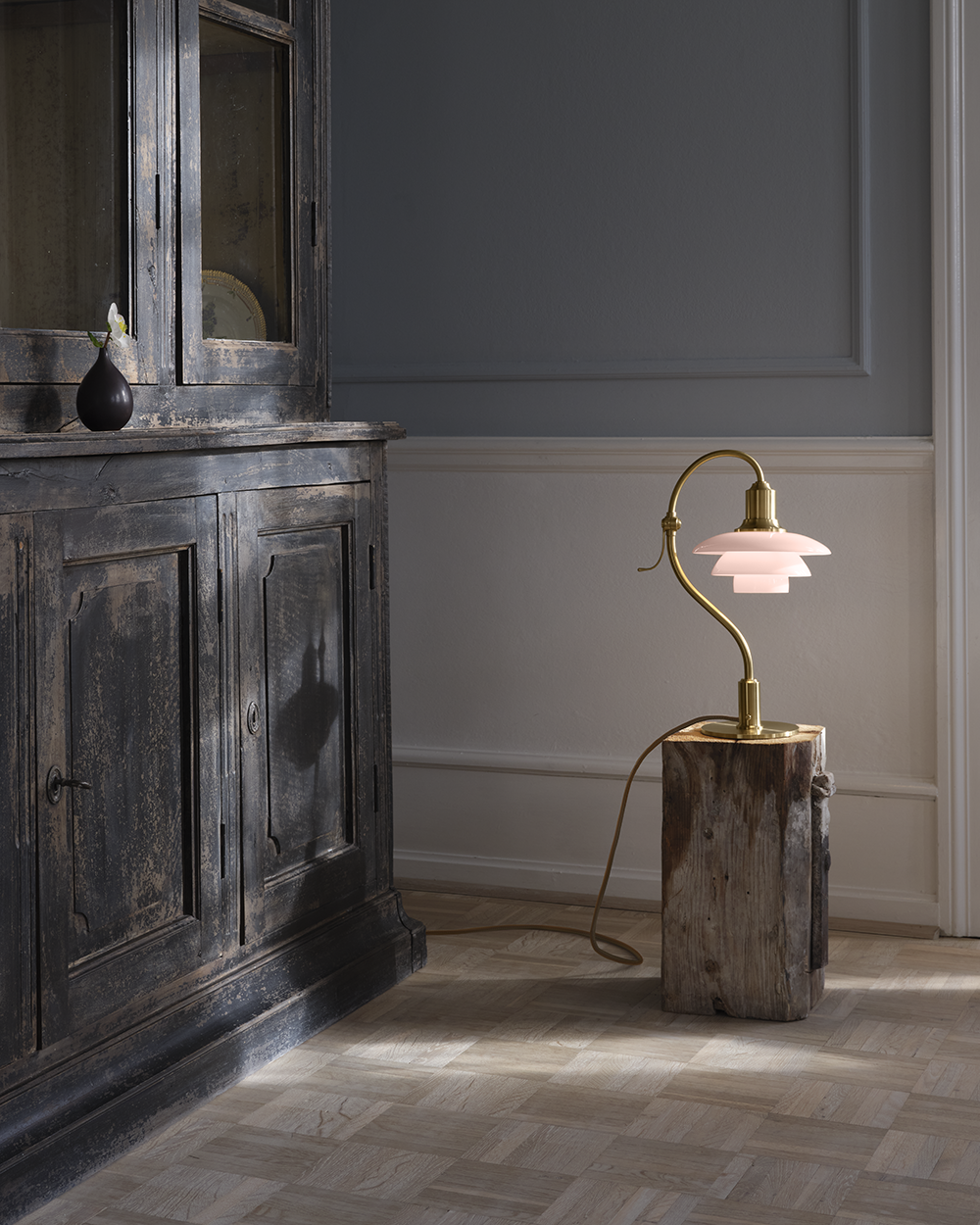ポール・ヘニングセンが1931年にデザインしたPH 2/2 クエスチョンマーク テーブルランプは、「システムPH」として知られる彼の3枚シェードのランプシステムに基づいており、3枚の吹きガラス製シェードが、やわらかなグレア・フリーの光を放ちます。この小さなテーブルランプの名前はそのステムが描く曲線に由来し、そのフォルムは個性的です。シェードの向きは調節可能で、光が必要な方向に左右どちらにも45度傾けることができます。1950年代半ばまで、PH 2/2 クエスチョンマーク テーブルランプは真鍮で作られ、クラシックな乳白ガラス製シェードのほか、アンバー(琥珀色)、レッド、イエローのカラーガラス製のシェードもありました。PH 2/2 クエスチョンマーク ペール・ローズ テーブルランプは、こうした歴史と、ヘニングセンが愛着を持っていた光と色に敬意を表して製作されました。