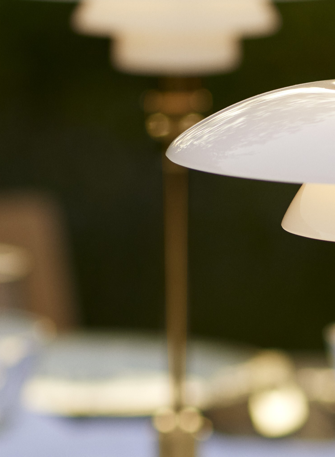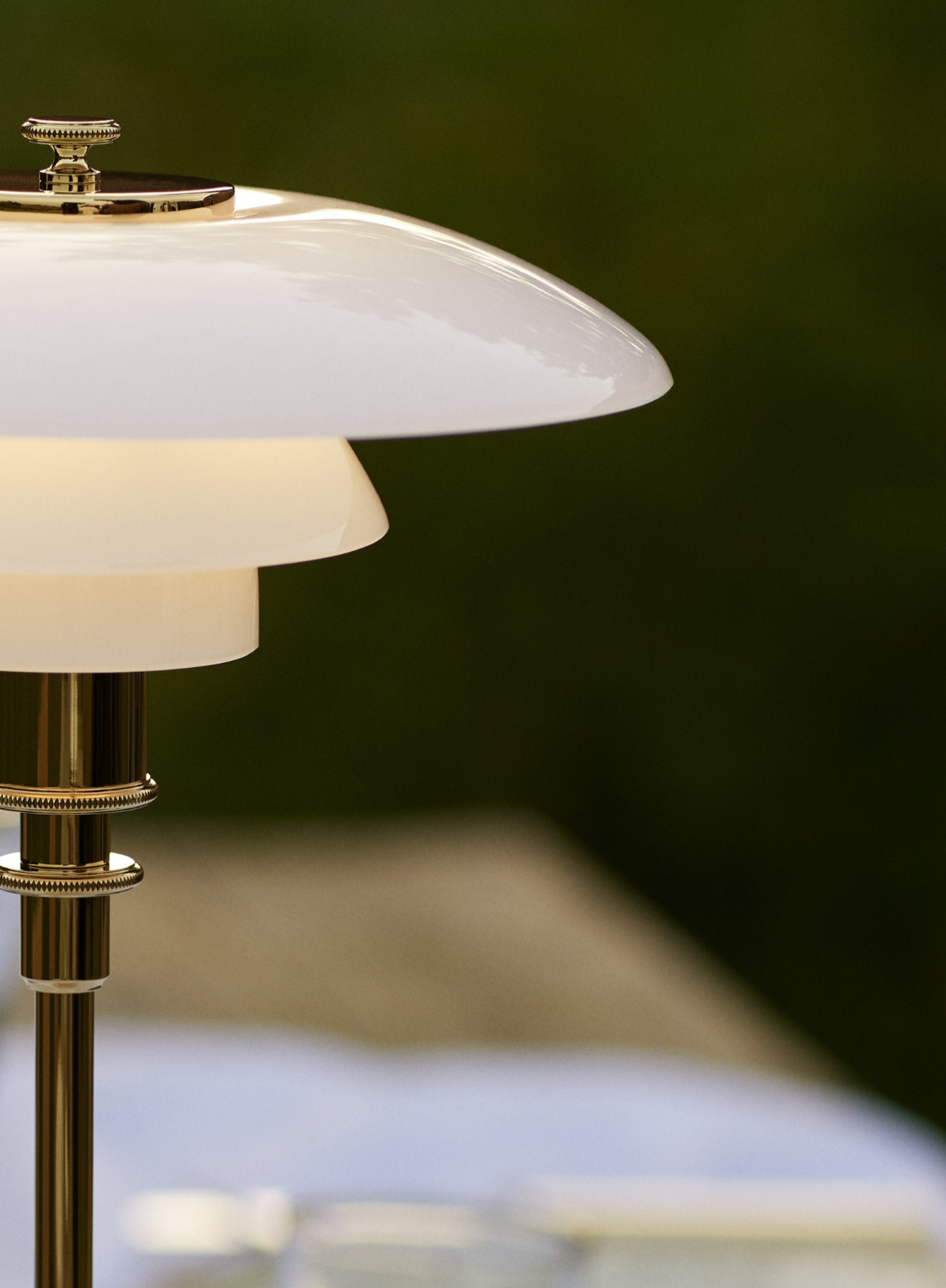 1925年から1926年にかけて、ポール・ヘニングセンは3枚シェードのシステムによる照明器具を開発しました。PHの最初の複数シェードのランプは、パリで開催された展覧会のために、ルイスポールセンと共同でデザインされました。両者のパートナーシップは、ヘニングセンが亡くなる1967年まで続きました。グレア・フリーの光(眩しさの除去)、明るさが最も必要とされる場所に光を届けること、同時に柔らかい影をつくりだすこと。これらが、生涯を通じてPHが追及した重要テーマで、その光源は当時の白熱電球でした。今日、3枚シェードのPHシリーズには屋外用の3種を含む18種類のランプがあり、PH 3/2 テーブルランプもそのひとつです。PHが設計したのは単なるランプではなく、包括的な照明システムであり、長年にわたり1000種にわたるモデルが生まれました。そこにはウォールランプ、テーブルランプ、フロアランプはもとより、天井の高い住宅用として1930年代にポピュラーとなったシャンデリアの数々も含まれます。たくさんの組み合わせやオプションもありました。色やサイズのヴァリエーションも豊富でした。初期のシェードは金属製で、内側を白、ゴールド、シルバーなどで塗装し、拡散する光、温かみのある光、クールな光など、使用場所に応じて仕上げを選択するようになっていました。その後、3枚シェードシステムにガラスが加わりました。乳白ガラスのシェードは、光を下方に集めると同時に、程よく部屋の上方も照らしだしました。PHは、照明器具のデザインに科学的アプローチを採用し、シェードの曲線に対数螺旋を使用した最初の人物でした。対数螺旋に基づくデザインを採用することで、シェードの曲面全体にわたってなだらかな配光を得ることに成功したのです。このなだらかな配光は、シェード内面が反射する拡散光と合わさって、グレアと影のコントロールを可能にしました。各シェードが反射する光量は、光源との距離が大きくなるにつれ均等に減少します。PH ランプのモデル番号は、シェードのサイズを表しています。最初の数字はトップ・シェードのサイズ(直径)を表し、次の数字はミドル・シェードと下部シェードのセットを表します。2/2というような「原型」モデルでは、直径約20 cmのトップ・シェードに、それに対応するミドル+下部シェードがセットされています。PH 3/2 テーブルランプは、直径約 30 cm のトップ・シェードに、 2/2 モデルのミドル+下部シェードのセットを組み合わせています。このような「ハイブリッド」モデルは、ペンダントを低く吊るしたいという要望に応えてデザインされました。そのシステムは、テーブルランプ、フロアランプ、ウォールランプに使用されています。