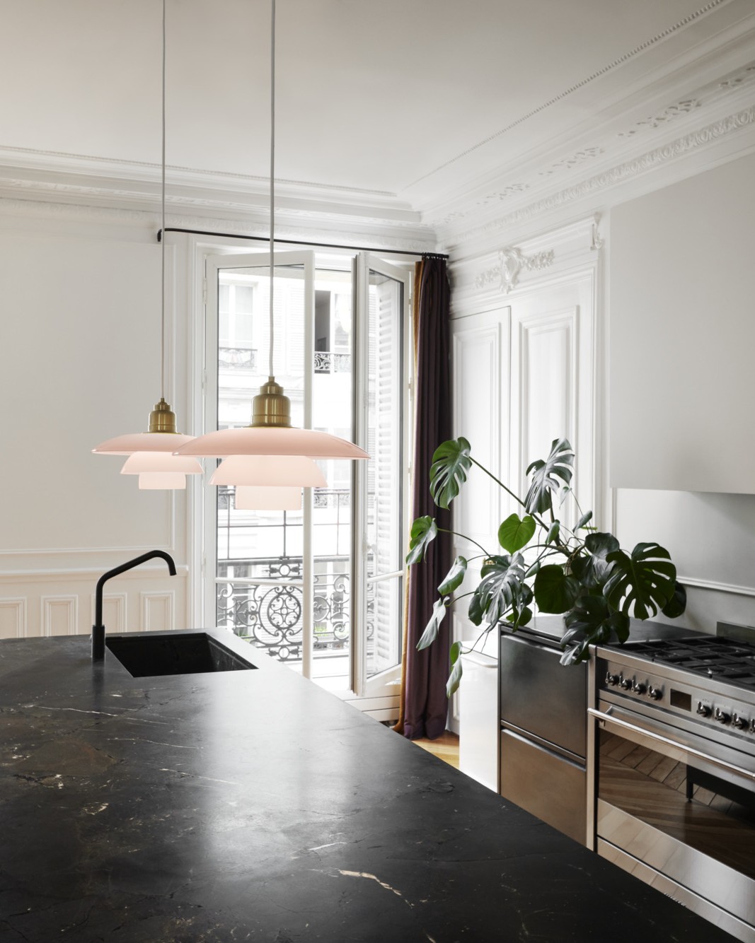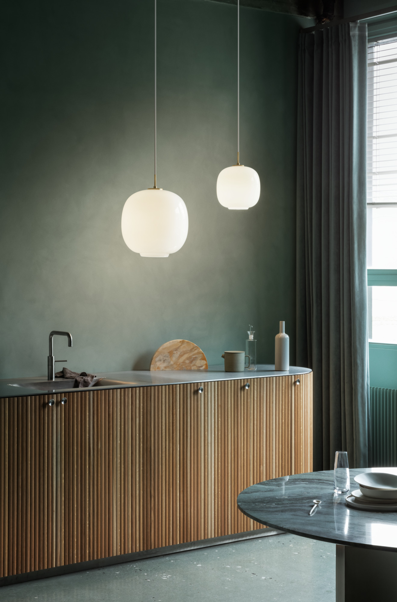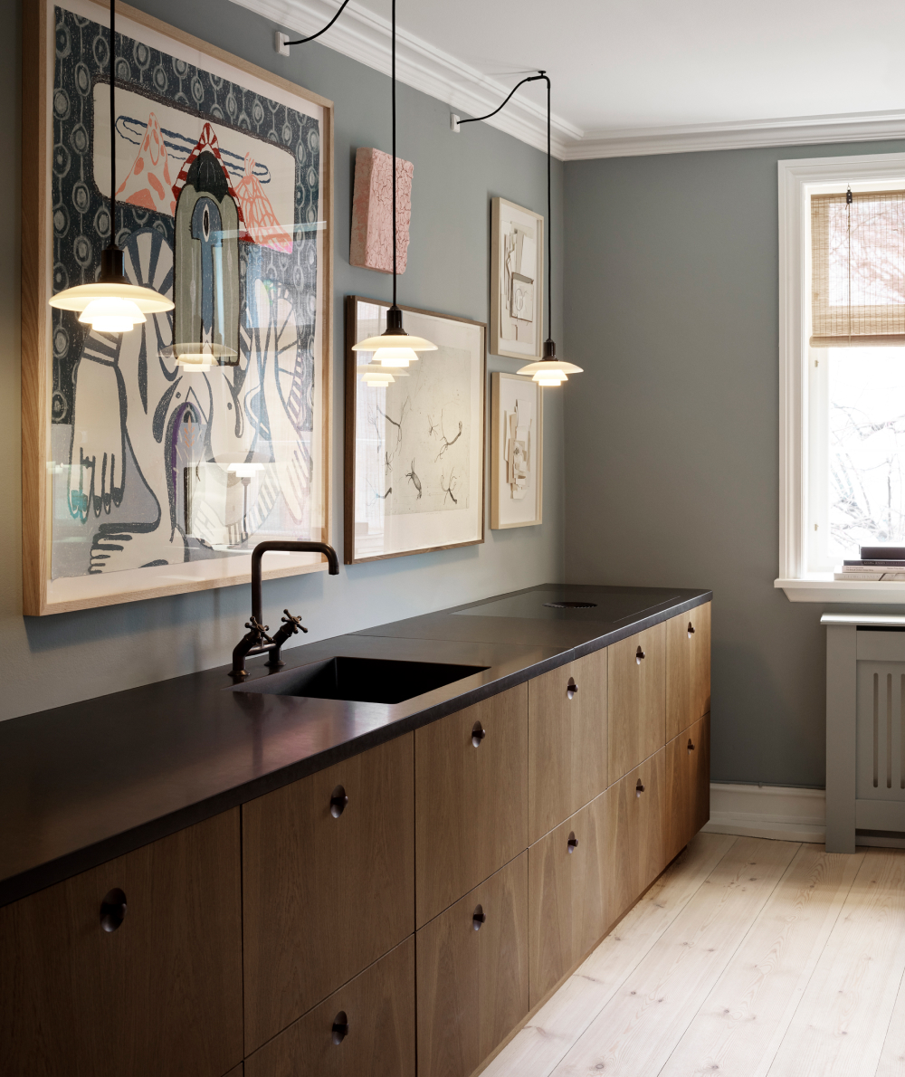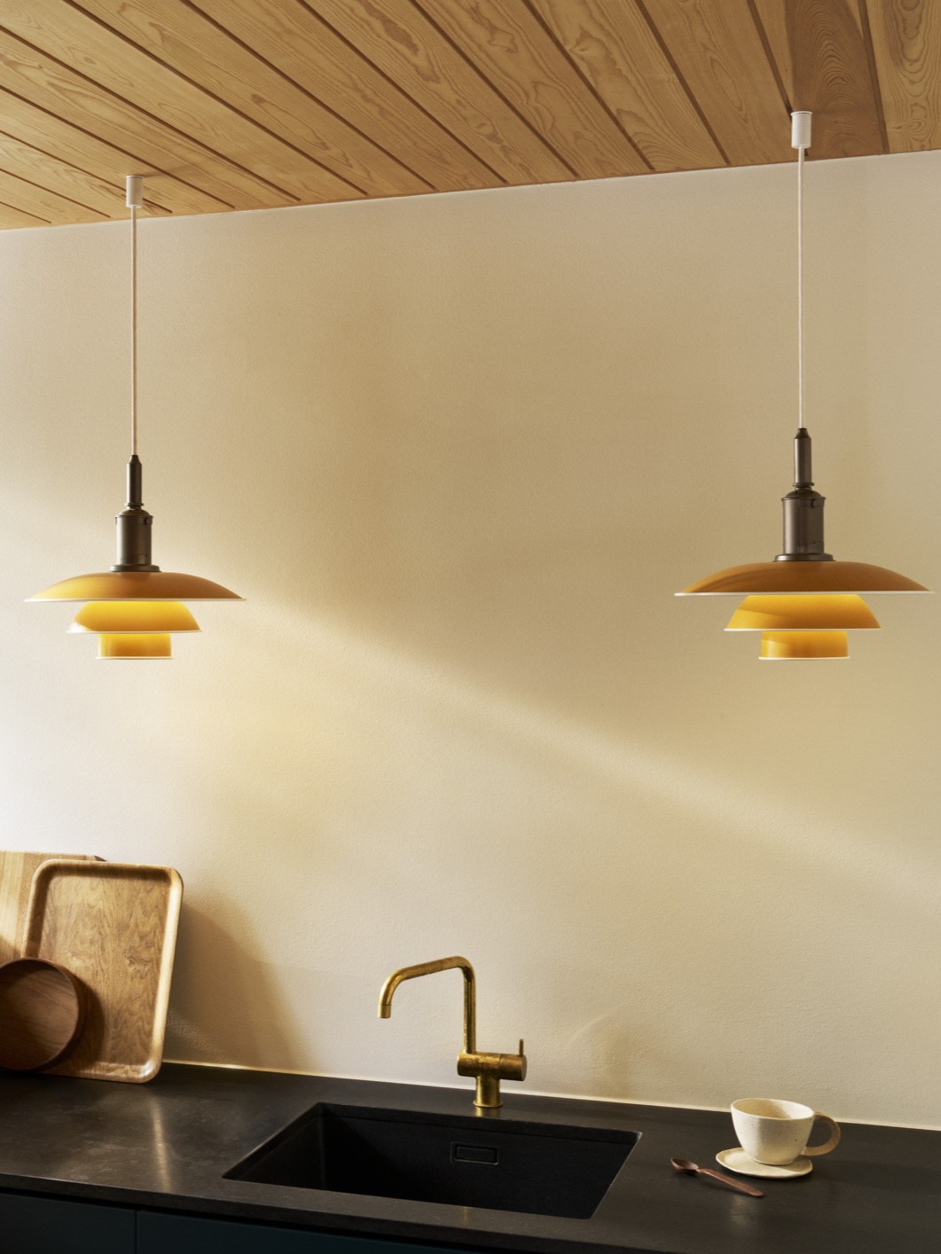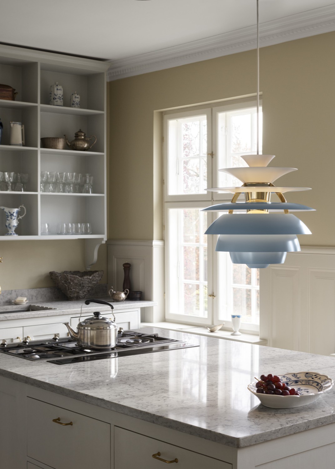 루이스 폴센의 펜던트 조명은 주방을 세련되고 따뜻하게 변화시킵니다.
