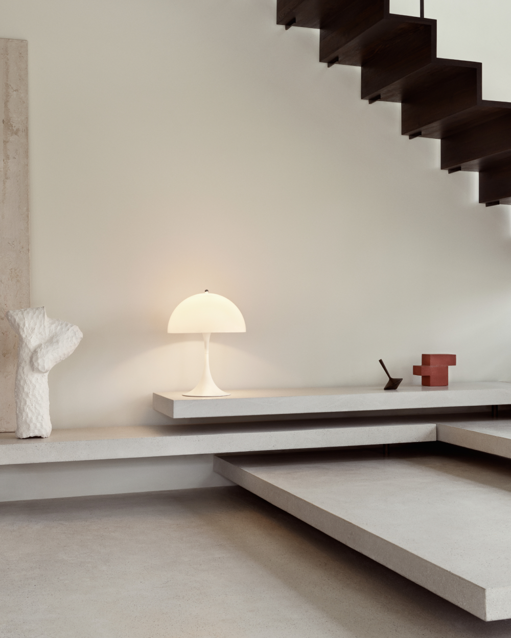 De Panthella 400 tafellamp, ontworpen door Verner Panton in 1971, is de perfecte balans tussen eigentijdse stijl en tijdloze elegantie. Het zacht diffuse licht wordt bereikt door een nauwkeurig vervaardigde, paddenstoelvormige kap, die zorgt voor een gelijkmatige verlichting zonder verblinding.
