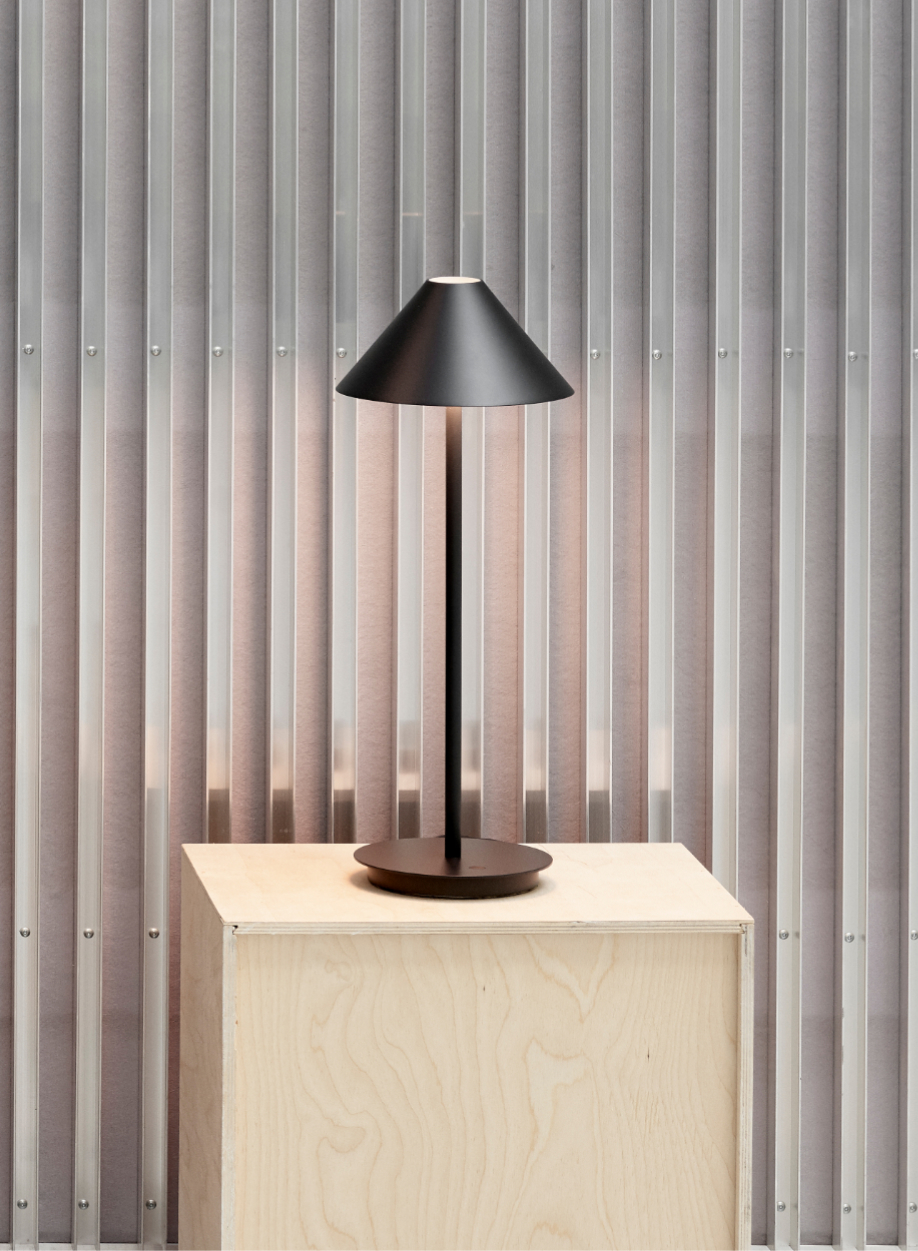 De Keglen Tafel heeft een grafische, simplistische uitstraling met zijn kegelvormige scherm en zorgt zo voor de perfecte sfeer. De schakelaar en dimmer zitten op de voet of pin. Bij de voet zit de kabel aan de zijkant, terwijl deze verticaal door de pin gaat. De Keglen Tafel is verkrijgbaar in zwart of wit, met een matte, nat gelakte afwerking. Hierdoor ontstaan overdag een fonkelend effect en reflecties van de omgeving wanneer de lamp is uitgeschakeld.