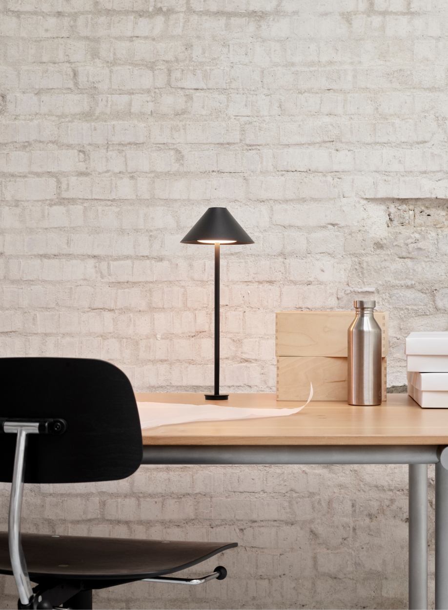 De Keglen Tafel behoort tot dezelfde productreeks als de Ø 175 Keglen Hanglamp. Het ontwerp is gebaseerd op hetzelfde scherm, waarbij de staander overgaat in de onderste diffusor om zo een prachtige organische geometrie te creëren. De tafellamp is verkrijgbaar met een voet of een pin, ideaal voor werk- en studieomgevingen.