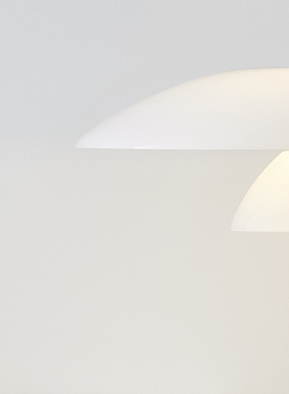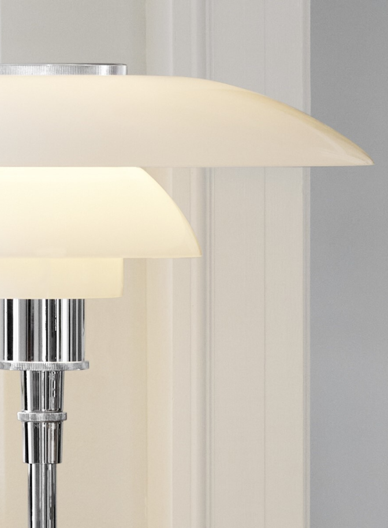 Poul Henningsen formgav treskärmssystemet redan 1925–1926, då han i samarbete med Louis Poulsen ritade de första lamporna till en utställning i Paris. Detta samarbete pågick ända fram till Poul Henningsens död 1967. Under hela sitt liv strävade PH efter att skapa det bländfria ljuset, att rikta ljuset dit där det behövdes och att skapa mjuka skuggor med glödlampan som ljuskälla. PH 4½-3½ Glas Bord tillhör treskärmsfamiljen, som i dag består av 30 olika lampor, varav tre för utomhusbruk. Poul Henningsen formgav alltså inte bara en lampa utan ett helt system, och under årens lopp har omkring tusen olika modeller producerats. Det stora utbudet bestod av bords-, golv- och vägglampor, och därutöver också många olika ljuskronor, som under 1930-talet blev mycket populära som högt placerad belysning i privata hem. Kombinationsmöjligheterna var oändliga. Det var inte bara möjligt att få lampor i många olika storlekar, utan även i olika färger. De första modellerna framställdes i metall med lackerade insidor i till exempel vitt, guld eller silver, beroende på om man ville ha ett dämpat, varmt eller kallare ljus. Senare framställdes treskärmssystemet i glas. Glaslamporna gav, förutom det nedåtriktade ljuset, också mer ljus i rummet. Poul Henningsen var en av de första som ägnade sig åt belysningsdesign ur ett vetenskapligt perspektiv, och som utgångspunkt använde han den logaritmiska spiralen. Tack vare uppbyggnaden kring den logaritmiska spiralen lyckades han få en jämn fördelning av ljuset över glasskärmens hela kurva, och denna jämna fördelning av ljuset tillsammans med den diffusa reflexionen genom glaset gjorde det möjligt att kontrollera lampans bländning och skuggbildning. Varje skärm minskar mängden ljus lika mycket tack vare avståndet till själva ljuskällan. PH-lampornas nummer refererar till skärmstorleken. Varje överskärmstorlek har ett motsvarande set av mellan- och underskärmar, de så kallade hela modellerna som till exempel 2/2, där överskärmen har en diameter på cirka 20 cm med tillhörande underskärmar. PH 4½-3½ Glas Bord består av en överskärm på cirka 45 cm, men med underskärmar från 3½-modellen. Dessa så kallade skeva modeller introducerades eftersom man ville kunna hänga pendlarna lägre. Systemet användes även till vägg-, bords- och golvlampor. PH 4½-3½ Glas Bord introducerades i sin nuvarande form år 1990.